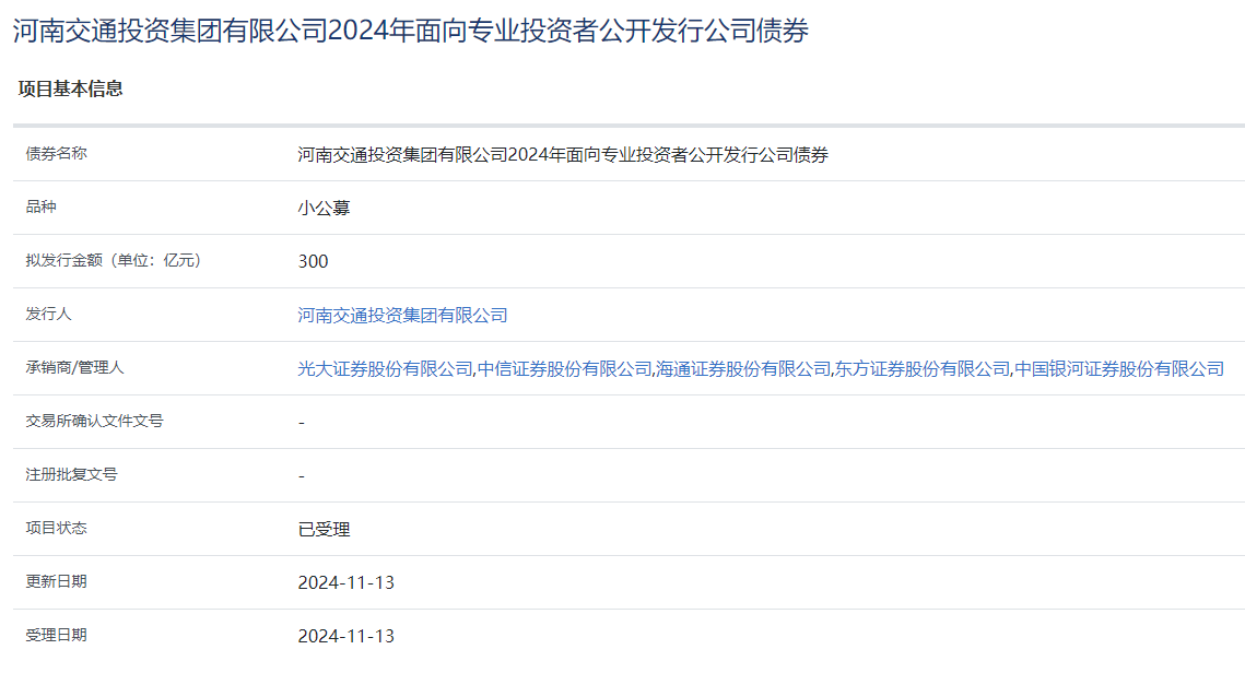 【大河财立方消息】11月13日,据上交所公司债项目信息平台披露,河南交通投资集团有限公司2024年面向专业投资者公开发行公司债券获上交所受理。