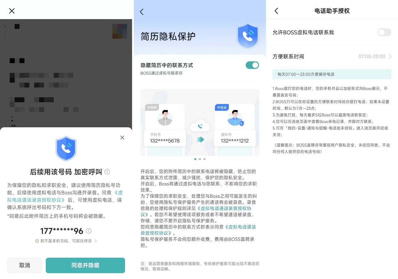 此外,团队也建议求职者,遇到一上来就要联系方式与简历的招聘者,不要着急交换。可以在平台上深入交流后再做决定。如果不想错过机会,又希望保护隐私,可以在平台上打开“电话助手”功能,让招聘方可以通过虚拟电话联系到自己。
