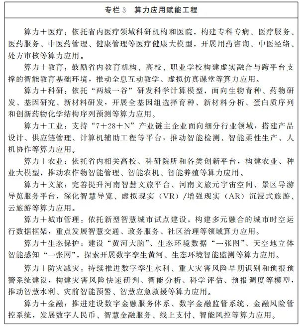 4.强化算力赋能。开展算力赋能专项行动,聚焦“7+28+N”产业链群培育,鼓励企业开放应用场景,推动算力与各行业深度融合,加速数字化转型升级。面向教育、文旅、政务、科研、金融等场景需求,积极推广算力应用解决方案,打造一批可复制、可推广的典型应用案例。围绕医疗、农业、交通运输、物流等优势行业,推动垂域行业大模型建设,打造“算力、算法、数据”的生态闭环。引进一批高水平算力运营服务企业,提升算力集群一站式服务能力。推动开发区加快开展算力调度和应用,提升开发区数字化、智能化运营能力,带动区内企业数字化转型。