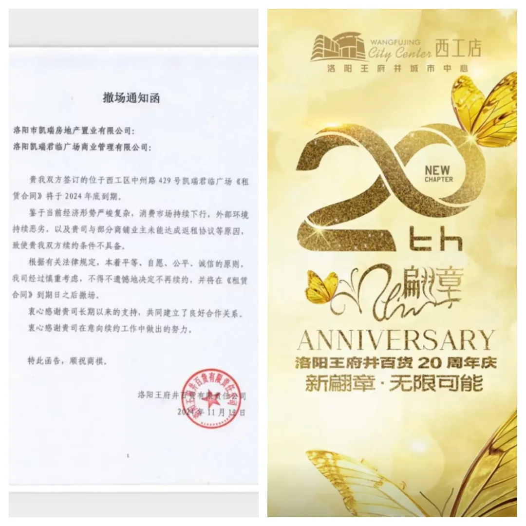 【大河财立方 记者 陈薇】11月12日,网上流传一张洛阳王府井百货有限责任公司,向洛阳市凯瑞房地产置业有限公司、洛阳凯瑞君临广场商业管理有限公司发布的《撤场通知函》。通知函显示,由于续约条件不具备,双方租约将于今年年底到期。