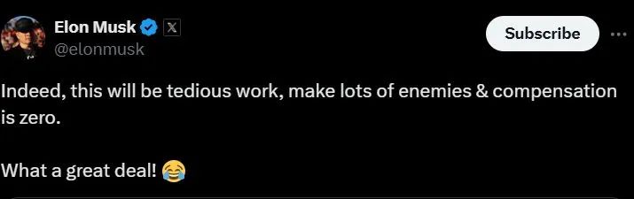 马斯克在其X账号上转发相关招聘公告并称,“它开始了。”此外,马斯克还表示,这将是一项乏味的工作,树敌很多且报酬为零,“多划算”!