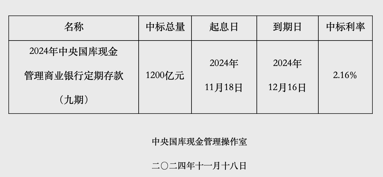 本期国库现金定存规模1200亿元,起息日2024年11月18日,到期日2024年12月16日,中标利率2.16%。
