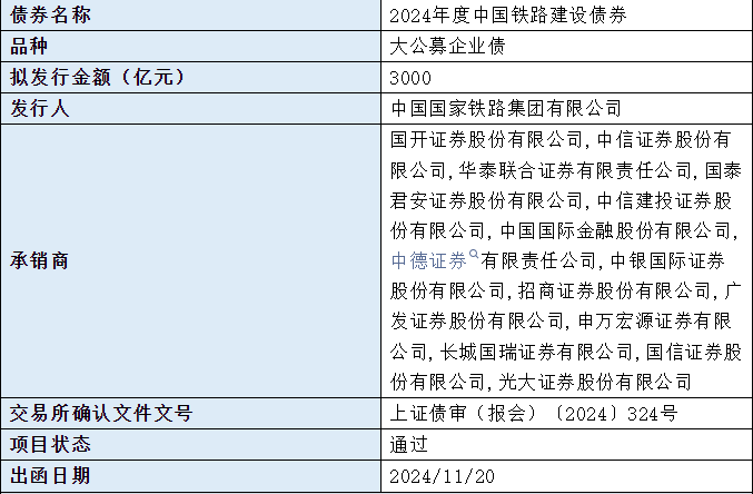 【大河财立方消息】11月21日,2024年度中国铁路建设债券项目获上交所通过,发行人为中国国家铁路集团有限公司。