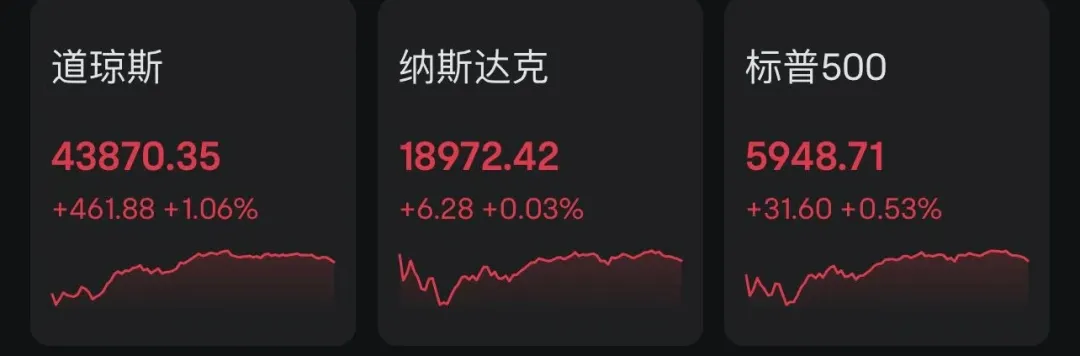 当地时间周四,美股三大指数集体收涨。截至收盘,道指涨461.88点,涨幅1.06%,报43870.35点;纳斯达克指数涨6.28点,涨幅0.03%,报18972.42点;标普500指数涨31.60点,涨幅0.53%,报5948.71点。