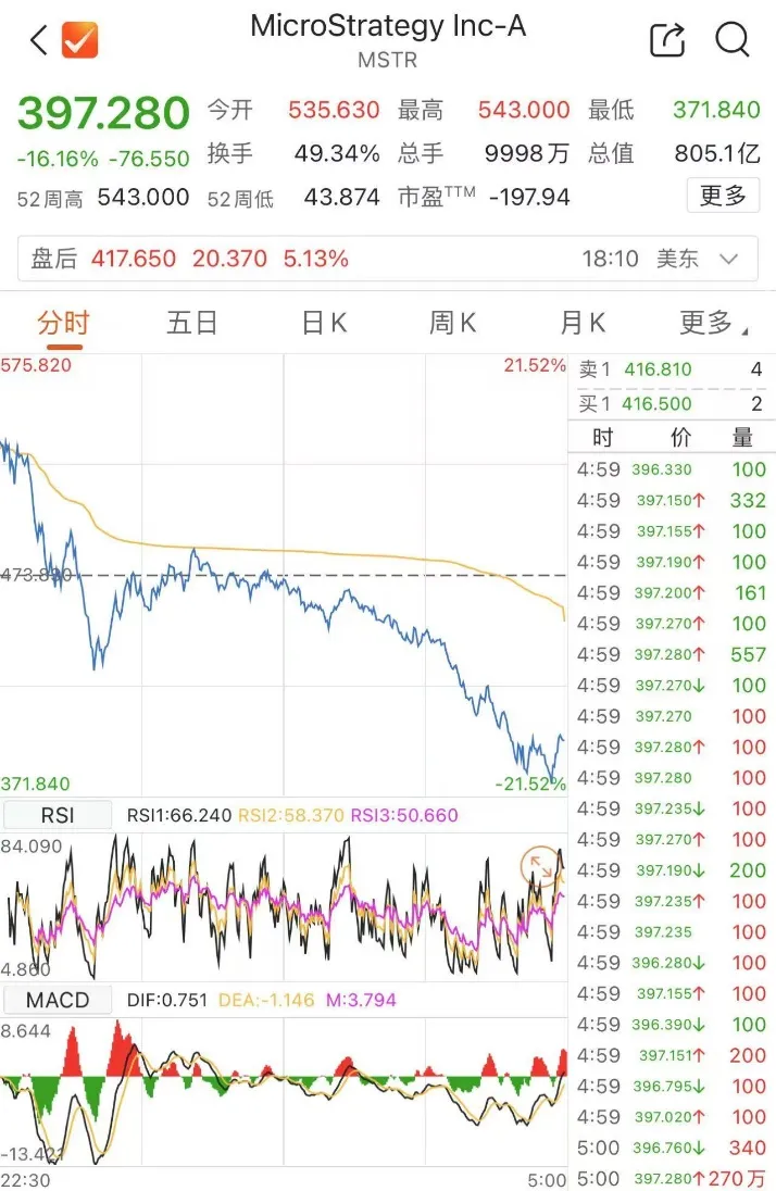 与此同时,“比特币持仓大户”微策略公司MicroStrategy(MSTR)股价也经历了一轮“过山车行情”。盘初,微策略延续此前涨势,一度冲高逾14%,刷新历史新高,每股股价上触543美元。但很快急转直下,盘中最大跌幅超过21%,从543美元/股高位跌至371.84美元/股。尾盘跌幅小幅收窄至16.16%,收报397.28美元/股。