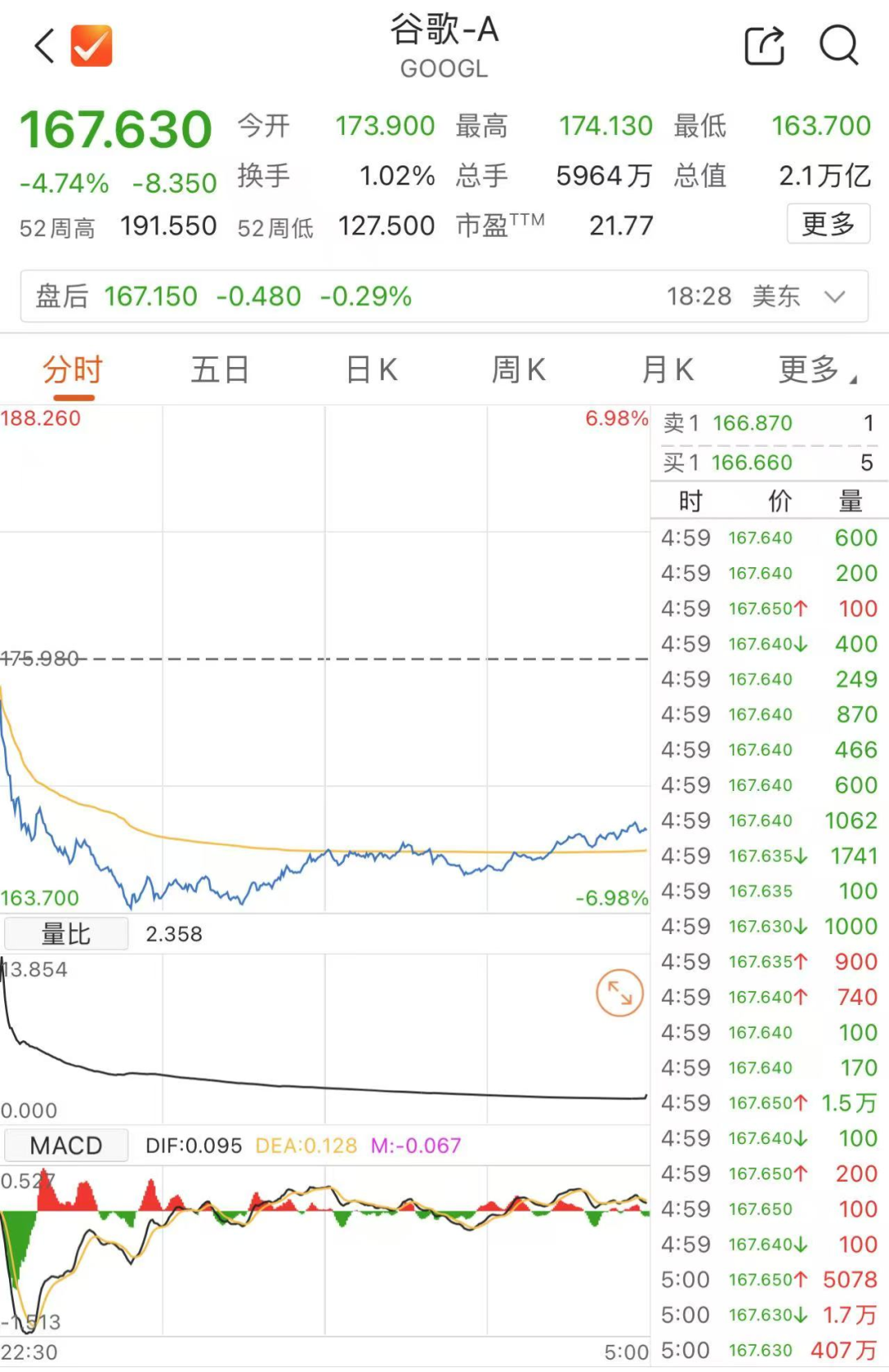当地时间周四,谷歌股价开盘后一路走低,盘中一度跌近7%,临近尾盘跌幅有所收窄,最终该公司股价收跌超4%,创11月以来收盘新低。