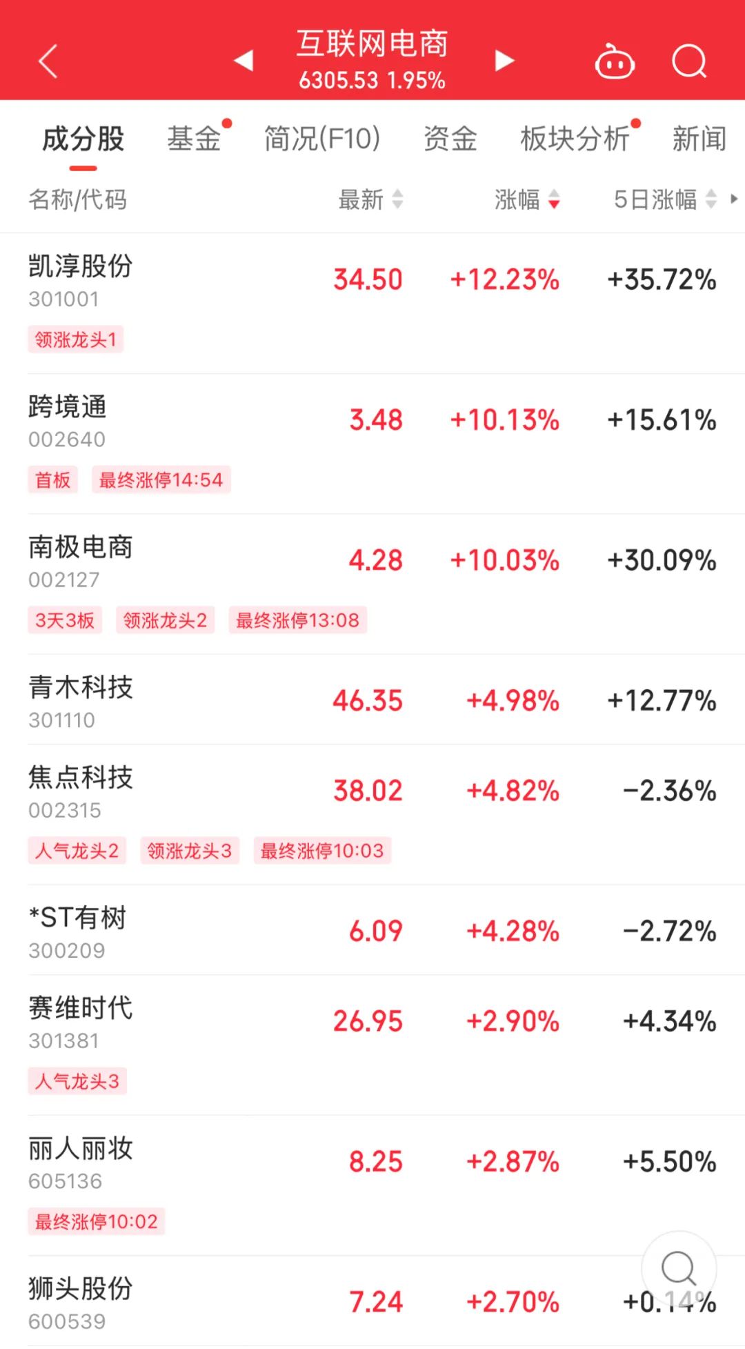 互联网电商领涨行业板块。跨境通、南极电商涨停。