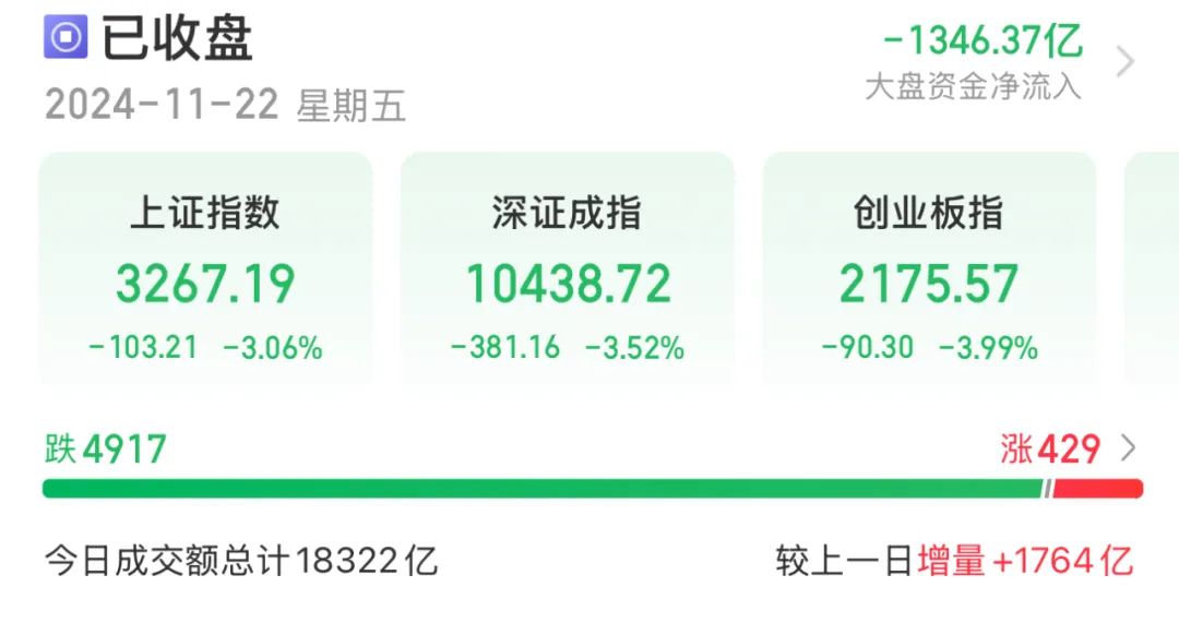 截至收盘,上证指数跌3.06%,深证成指跌3.52%,创业板指跌3.99%,全市场成交额1.83万亿元,较上一交易日放量1764亿元。