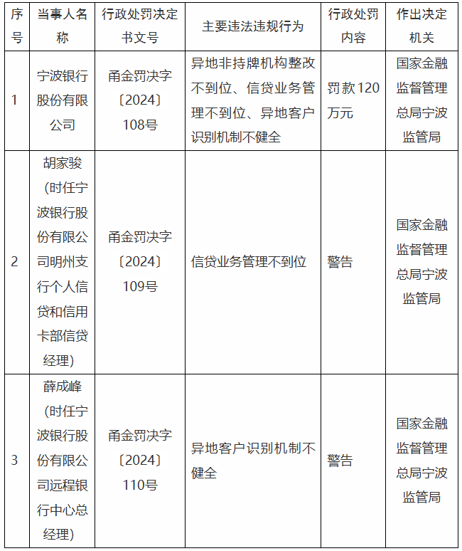 时任宁波银行明州支行个人信贷和信用卡部信贷经理胡家骏对信贷业务管理不到位负有责任,时任宁波银行远程银行中心总经理薛成峰对异地客户识别机制不健全负有责任,二人均被予以警告。