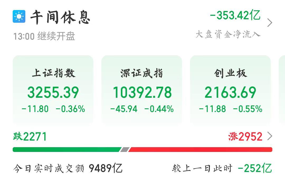【大河财立方 记者 史冰倩】11月25日,A股三大指数高开低走。截至午间收盘,上证指数下跌0.36%报3255.39,深证成指下跌0.44%报10392.78,创业板指下跌0.55%报2163.69。全市场半日成交额9489亿元,较上个交易日缩量252亿元。