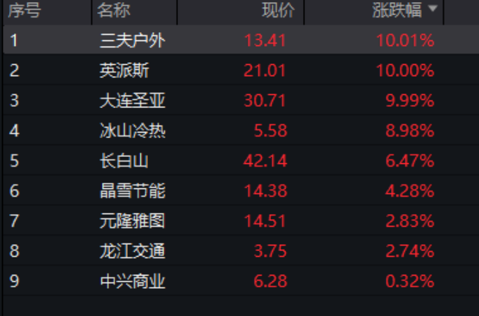 此外,冰雪旅游概念股领涨,三大户外、大连圣亚涨停,冰山冷热涨近9%,长白山涨超6%。