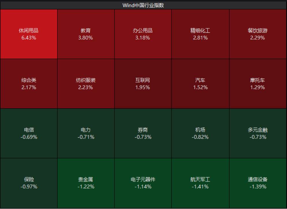 从板块来看,休闲用品、办公用品、教育、餐饮旅游、精细化工等板块领涨。通信设备、航天军工、电子元器件、贵金属、保险等板块跌幅靠前。