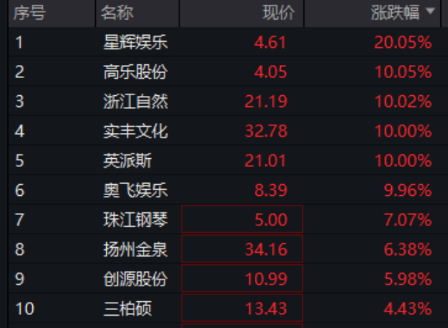 休闲用品板块中,星辉娱乐、高乐股份、浙江自然、实丰文化、英派斯、奥飞娱乐等个股涨停。