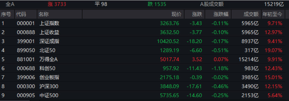 A股全天成交额1.52万亿元,较上一交易日缩量3043亿元。超3700只个股上涨,1500余只个股下跌。