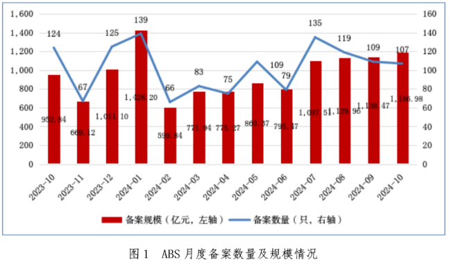 数据显示,2024年10月,资产支持专项计划新增备案107只,新增备案规模合计1186.98亿元。其中基础设施公募REITs所投ABS备案5只、108.98亿元。此外,新增备案规模前三的ABS基础资产分别为:不动产持有型ABS、小额贷款债权、应收账款,备案规模分别为318.80亿元、257.02亿元、234.83亿元。