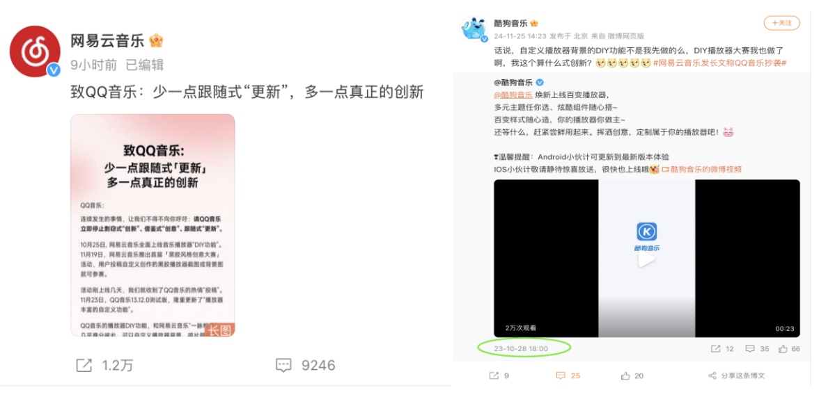 面对这一指责,与QQ音乐同属腾讯音乐娱乐集团(以下简称腾讯音乐)的酷狗音乐挺身而出,率先进行回应。就网易云音乐提出的音乐播放器“DIY功能”,酷狗音乐表示,2023年10月28日就曾推出该功能,并发问:“我这个算什么式创新?”