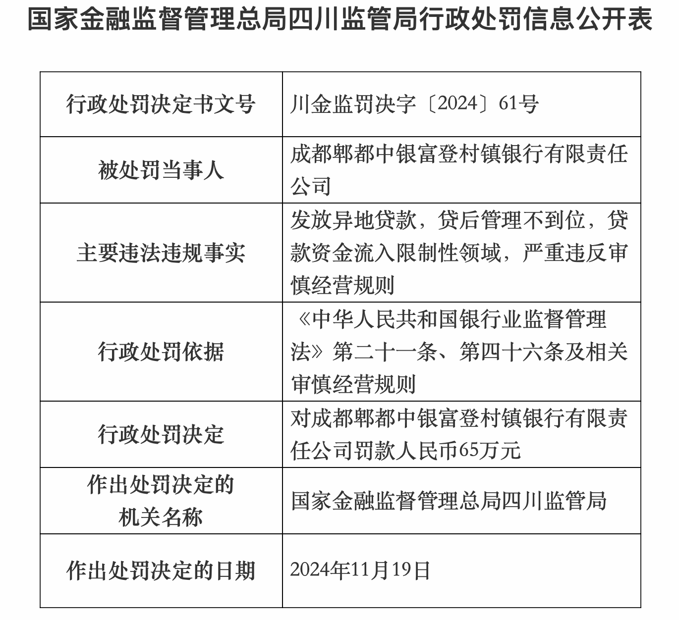 【大河财立方消息】11月26日,国家金融监督管理总局四川监管局行政处罚信息公开表显示,成都郫都中银富登村镇银行有限责任公司,因发放异地贷款,贷后管理不到位,贷款资金流入限制性领域,严重违反审慎经营规则的事项被罚65万元。