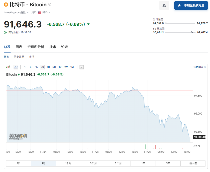本周以来,加密货币价格大幅调整,比特币从9.89万美元/枚左右,最低跌至9.15万美元/枚。截至周二晚间19时40分左右,24小时内,比特币下跌6.69%报9.16万美元/枚;以太坊跌近5%报3302美元/枚;其中品种方面,Solana跌超10%,XRP、狗狗币跌超13%,艾达币跌近16%。整个加密货币市场的市值,蒸发超1800亿美元。