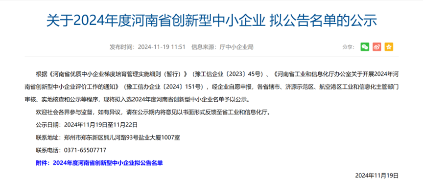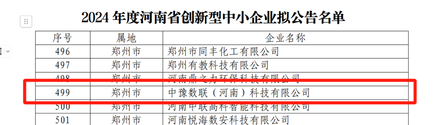 【大河财立方消息】近日,河南省工业和信息化厅公布《2024年度河南省创新型中小企业拟公告名单》,中豫数联(河南)科技有限公司(简称中豫数联)荣登榜单,成为中原豫资投资控股集团有限公司(简称豫资控股集团)旗下首家同时获得高新技术企业和创新型中小企业双重认定的核心子公司。