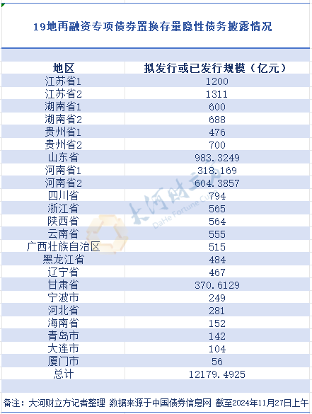 6万亿化债方案公布以来,全国已有19地披露了拟发行再融资专项债务置换存量隐性债务。大河财立方记者据中国债券信息网披露数据统计,截至发稿,全国19个地区披露的用于置换存量隐性债务再融资专项债券总额为12179.4925亿元。