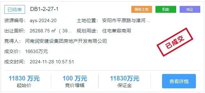 11月28日,记者从河南省土地使用权网上交易系统网站获悉,安阳市出让1宗住宅地块。根据成交结果,该地块溢价率40.6%,成交总价为16630万元。