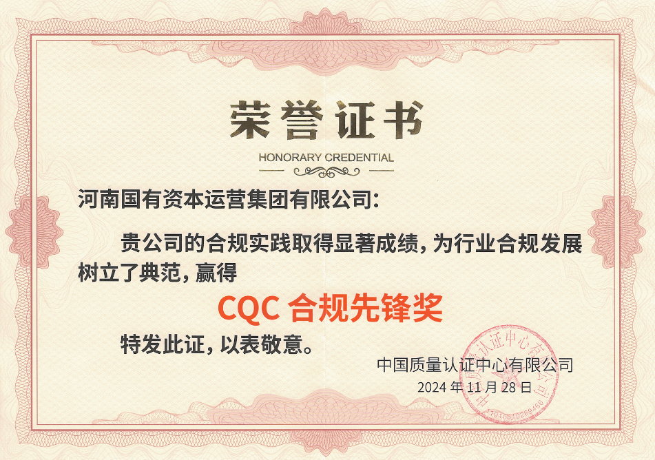 【大河财立方 记者 裴熔熔】11月28日,中国质量认证中心2024年度中国卓越管理颁奖大会在上海举行。河南资本集团凭借在合规管理体系建设、合规贯标认证等领域的突出成就,获得中国质量认证中心颁发的“合规先锋奖”。