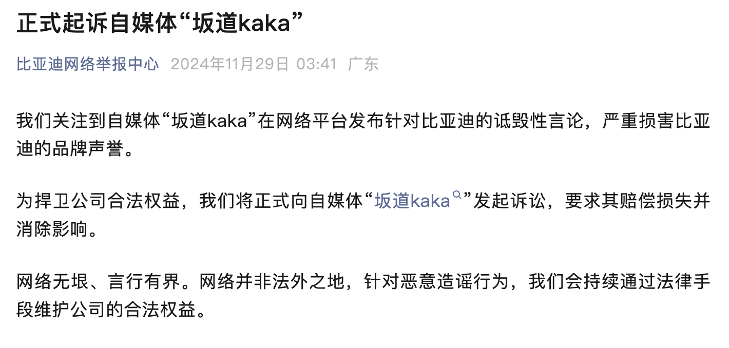 【大河财立方消息】11月29日,比亚迪网络举报中心发文称,近期关注到自媒体“坂道kaka”在网络平台发布针对比亚迪的诋毁性言论,严重损害比亚迪的品牌声誉。