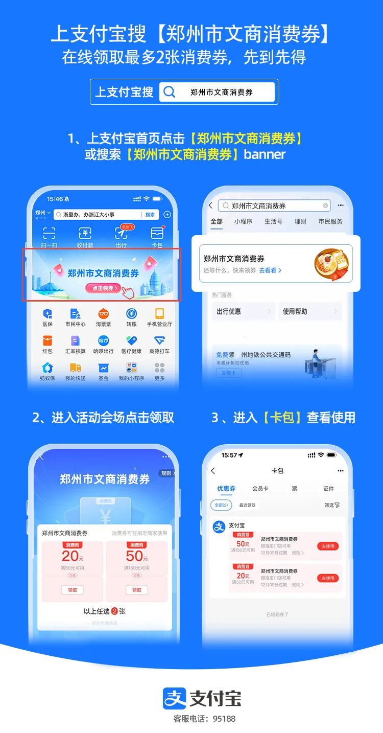 本次消费券分为20元、50元两类面值。具体使用规则为:20元券在消费金额满50元时便可使用,50元券则需消费满150元方能使用。消费者可依据自身消费习惯与场景需求,通过支付宝平台领取郑州市文商线下消费券,通过抖音领取郑州市文商线上消费券。