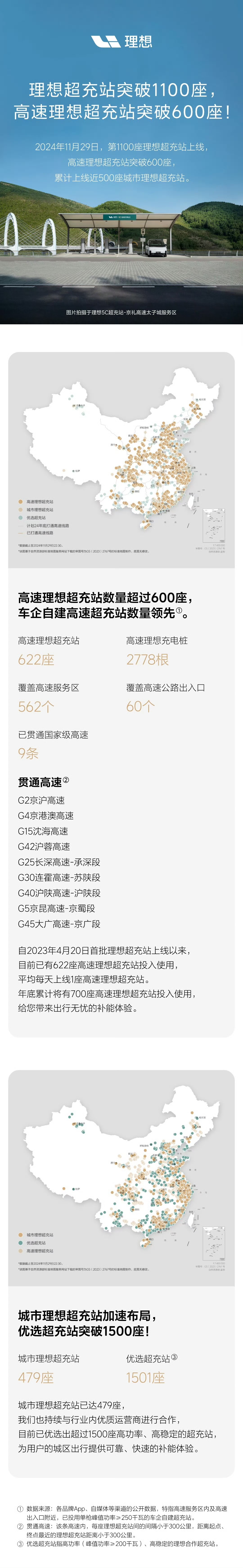 截至目前,高速理想超充站622座,覆盖562个高速服务区、60个高速公路出入口,贯通9条国家级高速,包括:G2京沪高速、G4京港澳高速、G15沈海高速、G42沪蓉高速、G25长深高速-承深段、G30连霍高速-苏陕段、G40沪陕高速-沪陕段、G5京昆高速-京蜀段、G45大广高速-京广段。