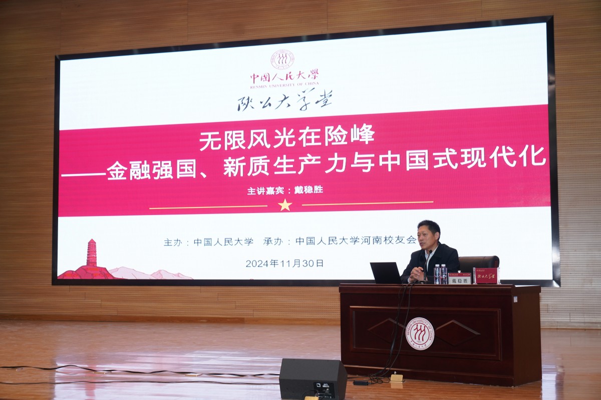 讲座现场,王群为戴稳胜颁发“主讲人”证书。戴稳胜以《无限风光在险峰——金融强国、新质生产力与中国式现代化》为题发表主旨演讲。戴稳胜从中国共产党的使命和特质切入,深入阐述了中国式现代化的独特之处,并提炼出实现这一目标的六项本质要求。他强调了金融作为国民经济血脉以及建设金融强国的重要性,并从历史经验中分析了建设金融强国的必要性和紧迫性。