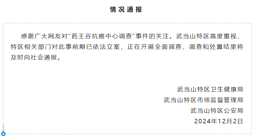 【大河财立方消息】12月2日晚,武当山特区卫生健康局、武当山特区市场监督管理局、武当山特区公安局发布情况通报:感谢广大网友对“药王谷抗癌中心调查”事件的关注。武当山特区高度重视,特区相关部门对此事前期已依法立案,正在开展全面调查,调查和处置结果将及时向社会通报。