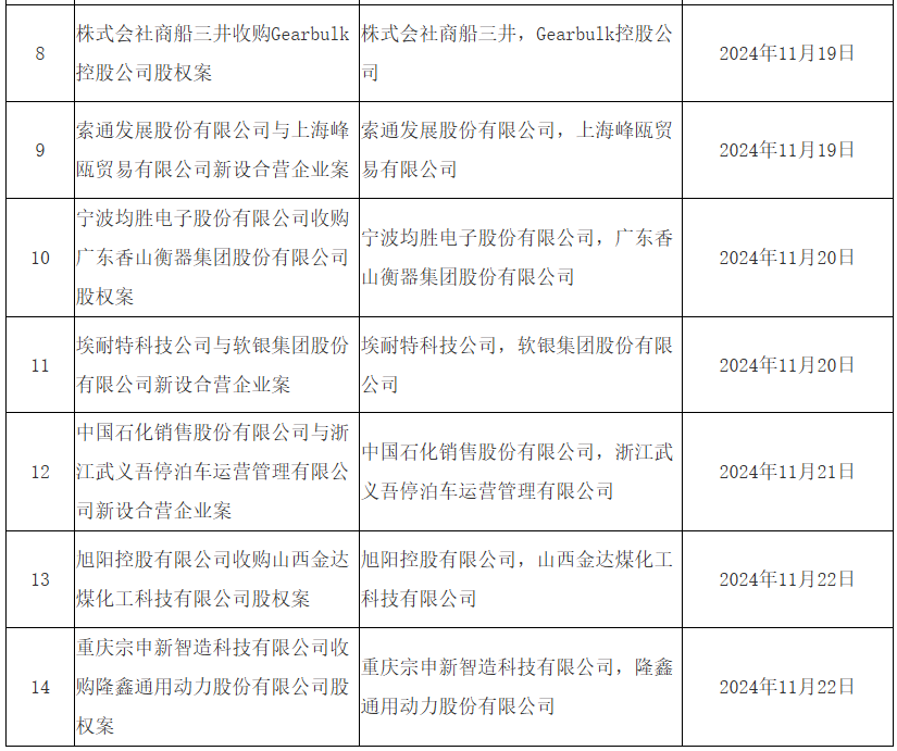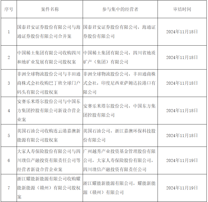 【大河财立方消息】12月3日,国家市场监督管理总局发布11月18日—11月24日无条件批准经营者集中案件列表,其中包括国泰君安证券与海通证券合并案、中国稀土集团收购四川和地矿业发展有限公司股权案等。