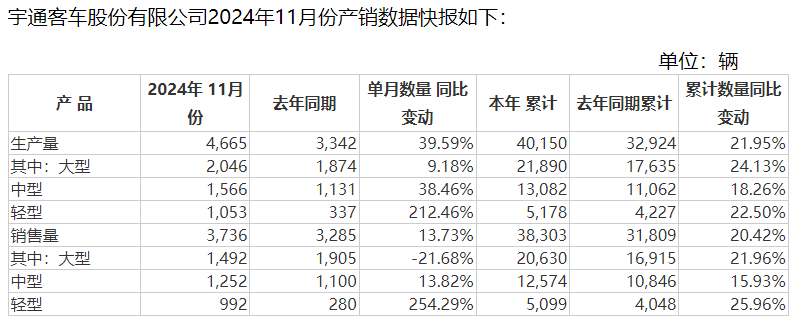 今年前11个月,宇通客车实现产量40150辆,同比增长21.95%,上年同期32924辆;实现销量38303辆,同比增长20.42%,上年同期31809辆。
