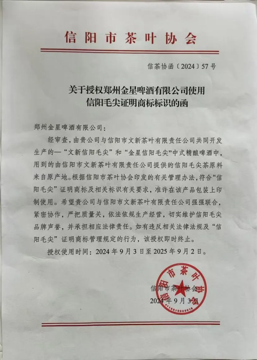 上述金星啤酒出具的“授权函”最后一句说,如有违反相关法律法规及“信阳毛尖”证明商标管理规定的行为,该授权即时终止。