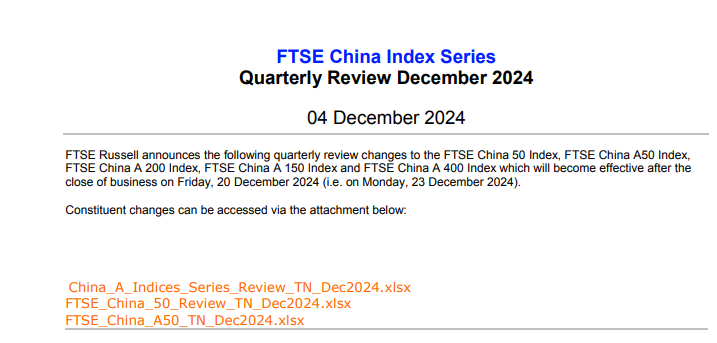12月4日盘后,富时罗素宣布对富时中国50指数、富时中国A50指数、富时中国A150指数、富时中国A200指数、富时中国A400指数的季度审核变更,该变更将于12月20日星期五收盘后生效。