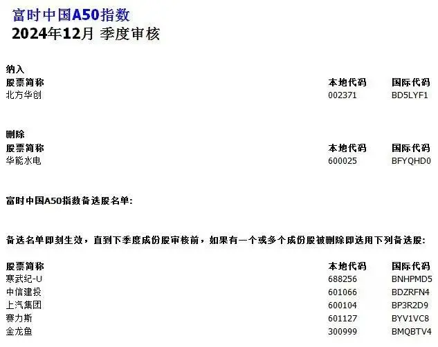 富时中国A50指数此次将纳入北方华创,删除华能水电,备选股名单包括寒武纪-U、中信建投、上汽集团、赛力斯、金龙鱼。备选名单即刻生效,直到下季度成份股审核前,如果有一个或多个成份股被删除即选用备选股。