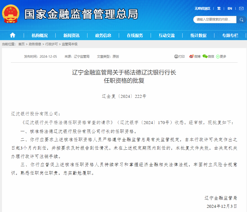 【大河财立方消息】12月5日消息,辽宁金融监管局批复,核准杨法德辽沈银行行长的任职资格。