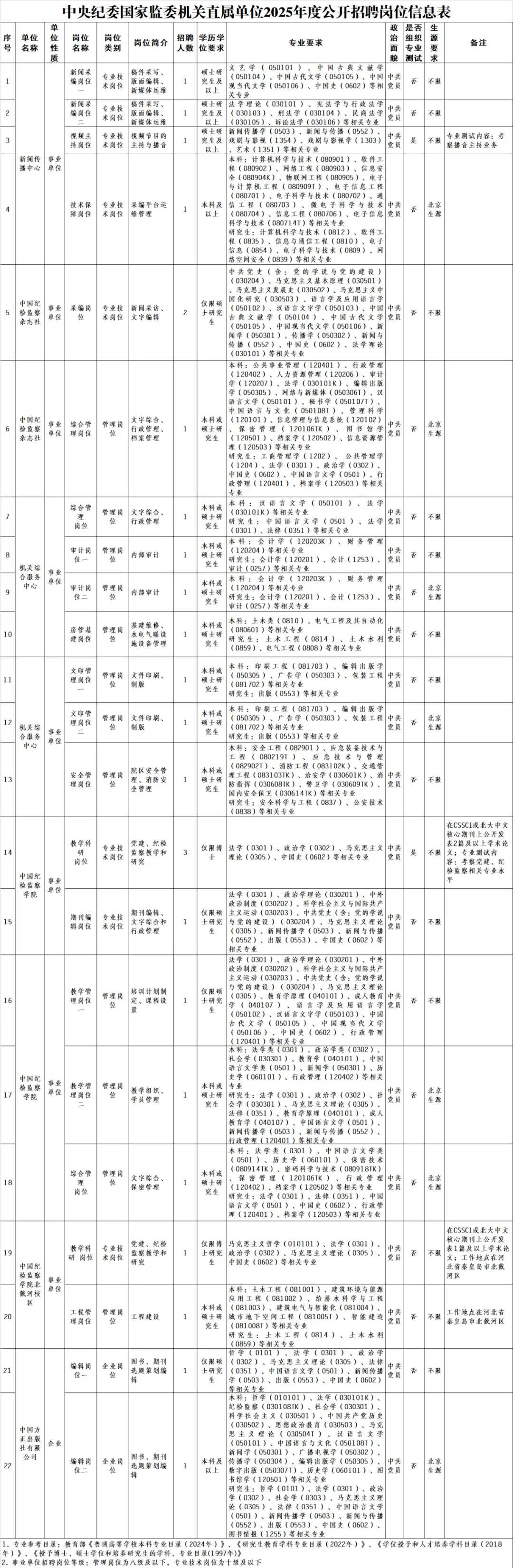此次招聘涉及22个岗位、计划招聘25人。其中,新闻传播中心招聘岗位涉及:新闻采编、视频主持,中国纪检监察杂志社招聘采编岗位,机关综合服务中心招聘岗位涉及:综合管理、审计,中国纪检监察学院招聘岗位涉及:教学管理、综合管理。具体情况如下:
