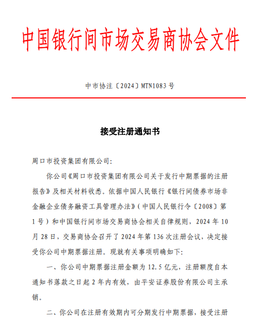 【大河财立方消息】12月6日,周口市投资集团有限公司获批注册12.5亿元中期票据,注册额度自2024年11月7日起2年内有效,由平安证券主承销。