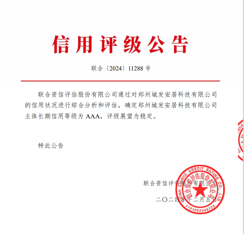 【大河财立方消息】12月5日,经联合资信综合评定,郑州城市发展集团有限公司下属子公司郑州城发安居科技有限公司(以下简称安居科技),取得AAA主体信用评级,评级展望为“稳定”,成功迈入国内企业信用等级第一梯队。