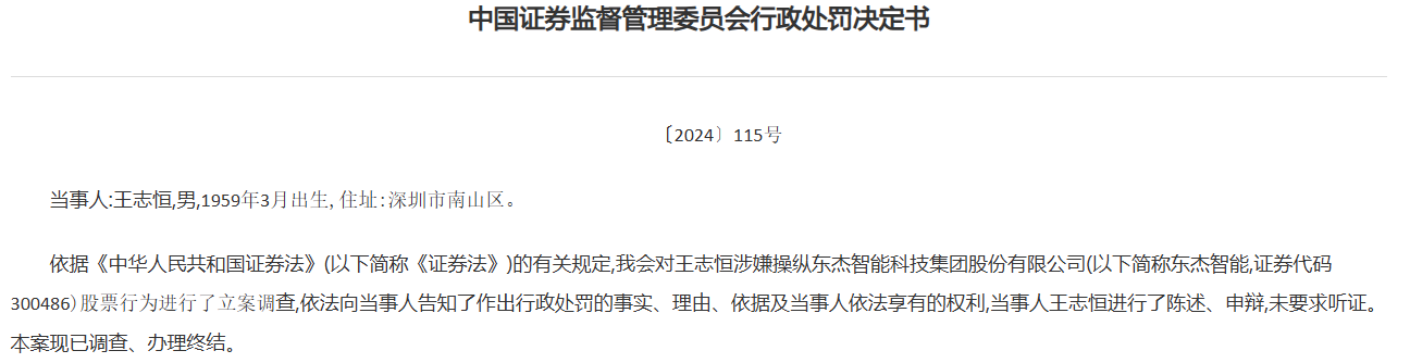 【大河财立方消息】12月7日消息,证监会近日披露一则行政处罚决定书,王志恒因操纵东杰智能科技集团股份有限公司(以下简称东杰智能)股票,被处罚款200万元。