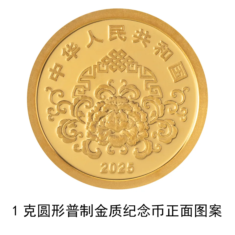双色铜合金纪念币正面图案为“中国人民银行”、“10元”字样,汉语拼音字母“SHIYUAN”及年号“2025”,底纹衬以团花图案。