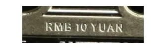 在硬币正面面额数字“10”的底端,可观察到“RMB 10 YUAN”的微缩文字。防伪特征效果见图4。