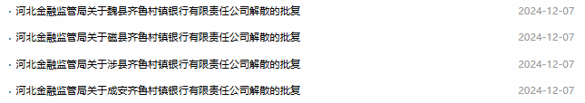 【大河财立方消息】12月9日消息,河北金融监管局近日公布4份行政许可批复,成安齐鲁村镇银行等4家银行因被邯郸邯山齐鲁村镇银行吸收合并而解散。