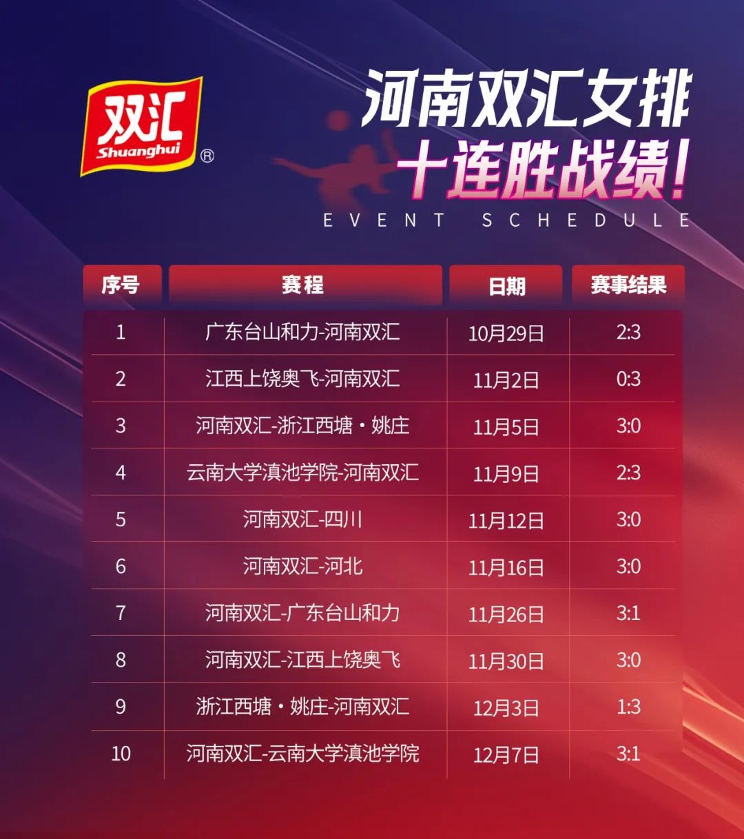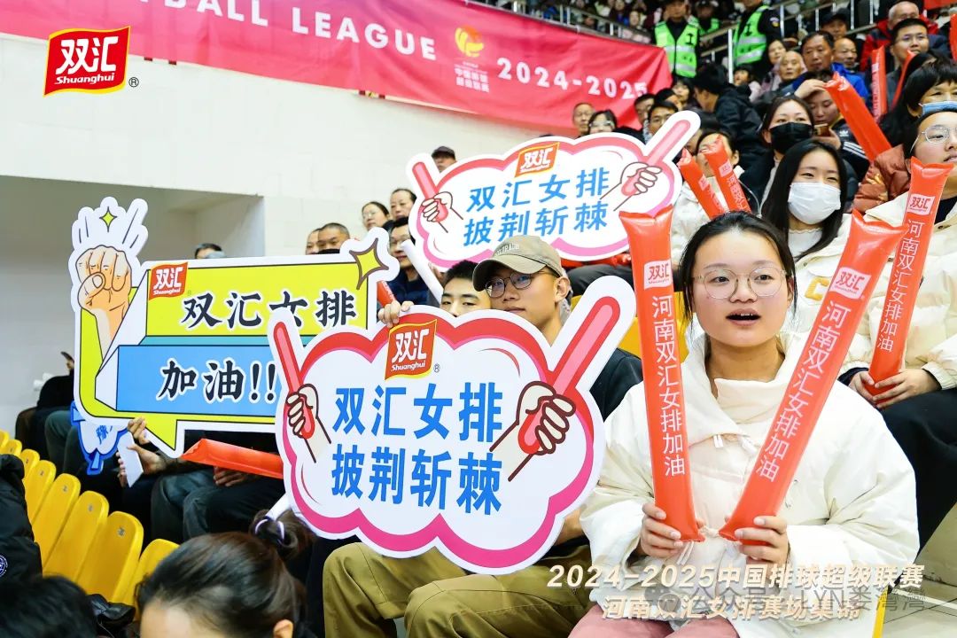 经过多年的培养和训练,河南双汇女排打造出了自己快速多变、通力合作、更强更稳的战术风格,形成了一支技术过硬、敢打敢拼、团结向上的专业球队。本届排球超级联赛开赛以来,双汇在赛场内外全程暖心陪伴,一方面,现场设置了双汇美食补给站,向女排队员和广大观众提供各类健康美食,主要有简颂单片午餐肉、鲜鸡蛋棒、金马克、爆汁香肠等;还定制发放气氛棒、员工观赛方阵以及设置提振势气、鼓劲加油的标语口号等,满满的健康美味和精神给养,全程赋能河南双汇女排,助力队员们豪取十连胜,见证她们创下了本赛季中国女排超级联赛的一项纪录,即成为了所有参赛队中唯一一支保持全胜的球队。