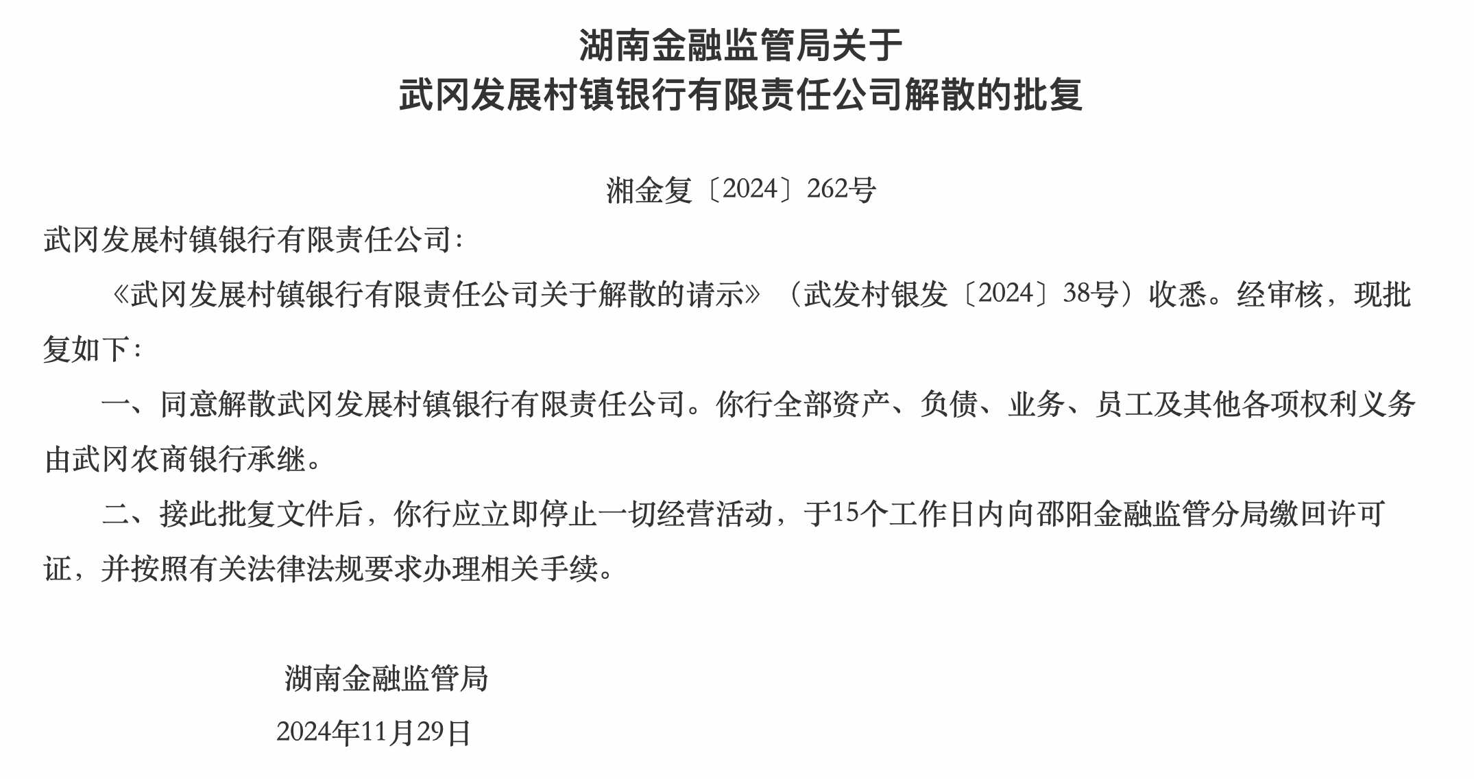 【大河财立方消息】12月9日,国家金融监督管理总局湖南金融监管局行政许可信息显示,两家村镇银行获批解散。