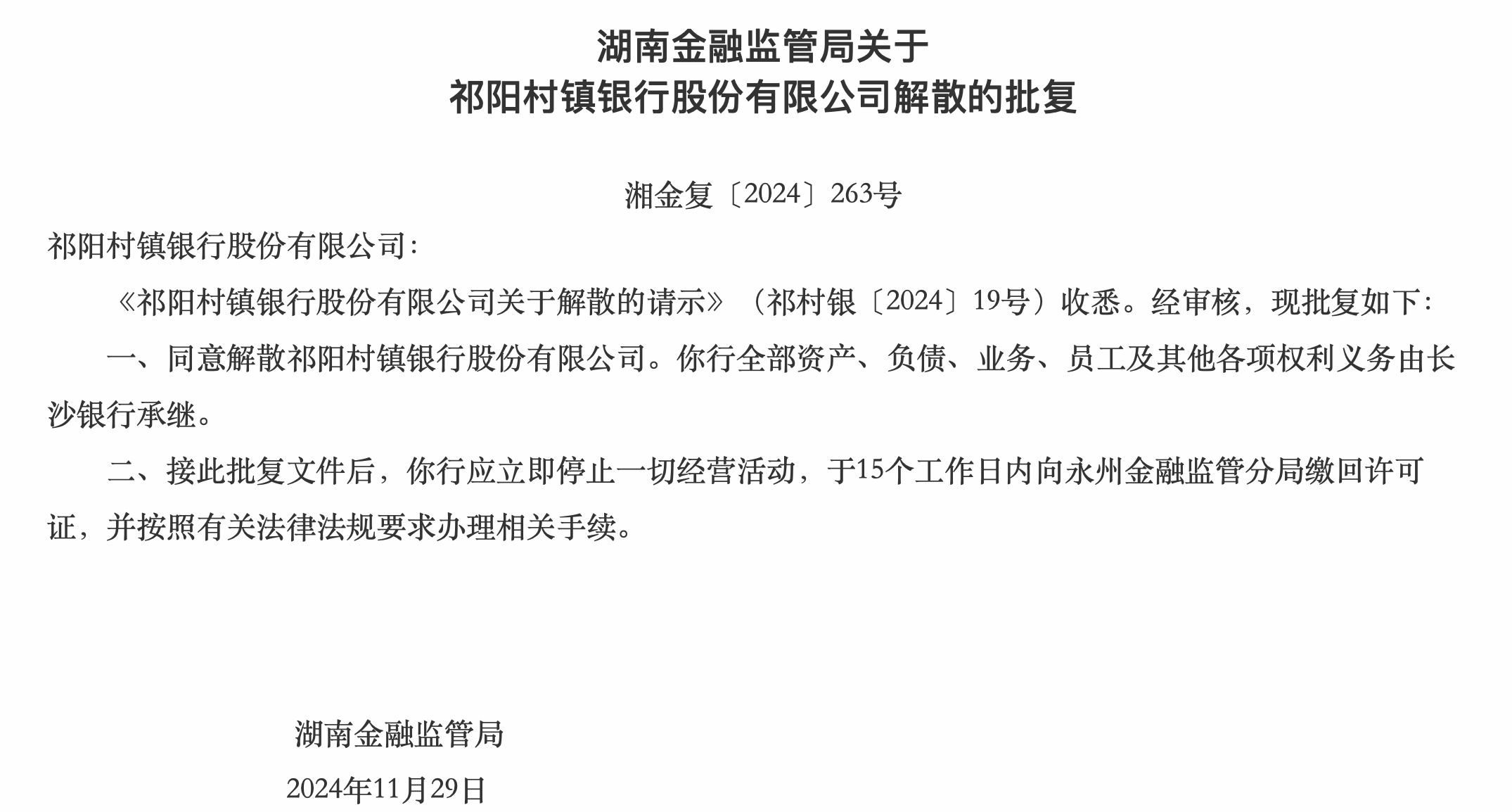 批复显示,同意解散武冈发展村镇银行有限责任公司,该行全部资产、负债、业务、员工及其他各项权利义务由武冈农商银行承继;同意解散祁阳村镇银行股份有限公司,该行全部资产、负债、业务、员工及其他各项权利义务由长沙银行承继。