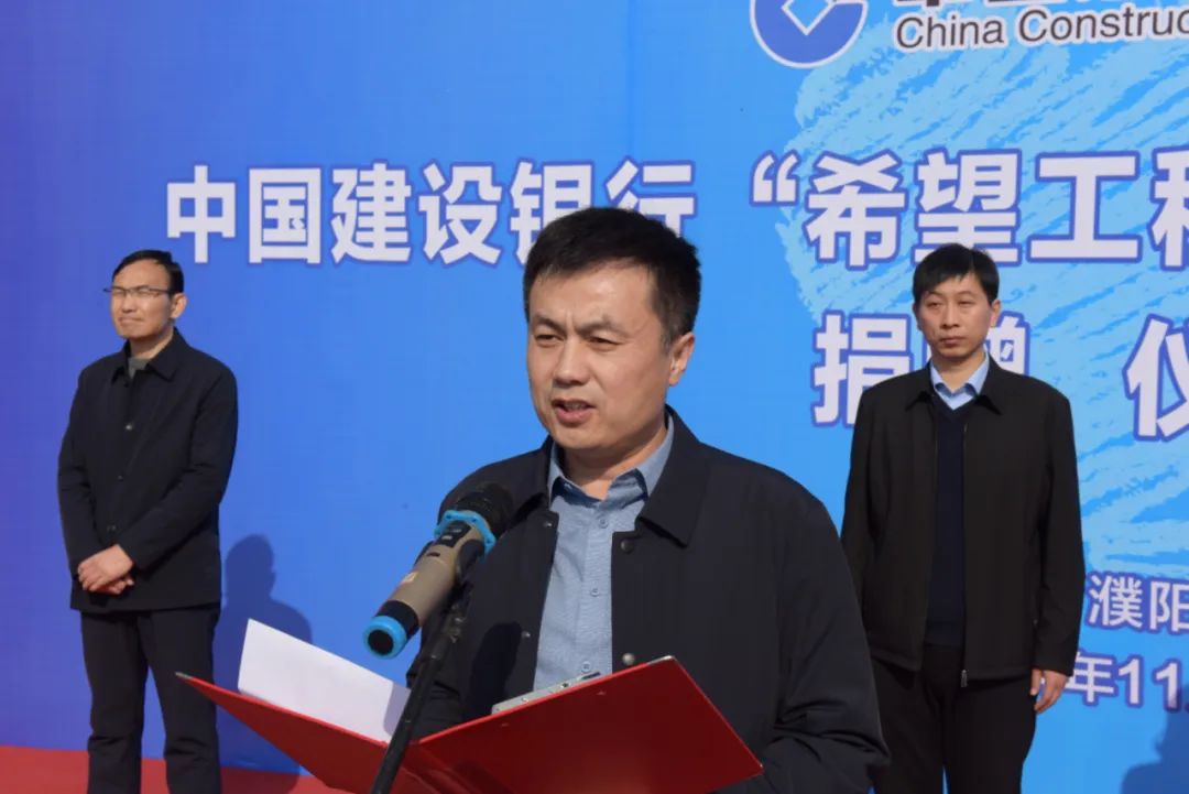 11月21日,中国建设银行“希望工程·建行五室”公益项目捐赠仪式在濮阳县子岸一中举行。中国建设银行河南省分行团委书记王耀君,团市委书记、市少工委主任闫兆敏,中国建设银行濮阳分行党委书记、行长颜劲松,濮阳县委常委、组织部部长韩善岭参加活动。团市委、中国建设银行濮阳分行,团县委、中国建设银行濮阳县支行负责同志,及濮阳县子岸一中师生代表共计100余人参加活动。