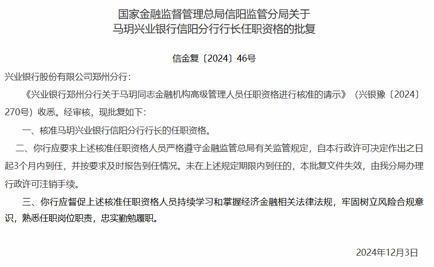 12月11日消息,国家金融监督管理总局信阳监管分局日前批复,核准马玥兴业银行信阳分行行长的任职资格。