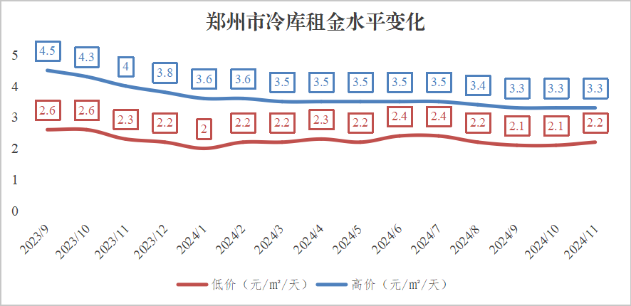 报告数据显示,11月,郑州市冷库租金价格低价为2.2元/㎡/天,相较5月份无变化,同比去年11月份下跌4.35%;租金高价为3.3元/㎡/天,相较5月份下跌5.71%,同比去年11月份下跌13.16%。